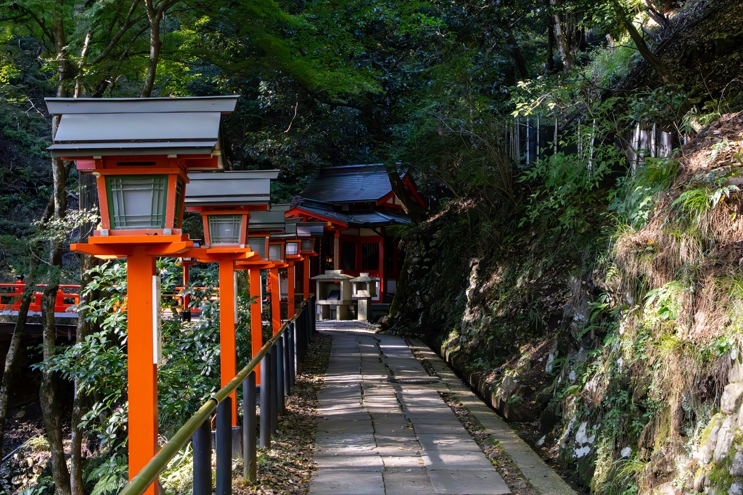 Der Abstieg setzt sich fort und bringt dich schließlich zum Sōjō-ga-tani Fudō-dō, einem kleinen Schrein, der etwas verborgen im Grün liegt. Die Atmosphäre hier ist besonders ruhig, fast abgeschieden, und lädt zu einem kurzen Innehalten ein. Ab hier spürt man, dass Kifune nicht mehr weit ist: Die Luft wird feuchter, das Moos dichter, und das leise Rauschen eines Flusses begleitet die letzten Schritte ins Dorf.