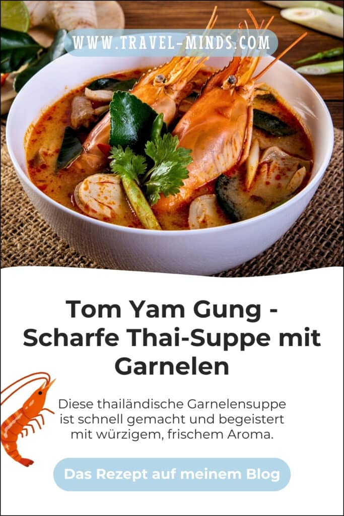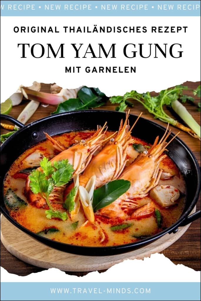 Tom Yam Gung (auch „Tom Yum Goong“) ist eine traditionelle thailändische Suppe mit Garnelen, die durch ihre intensive Kombination aus scharf, sauer und frisch besticht. Der Name setzt sich zusammen aus: