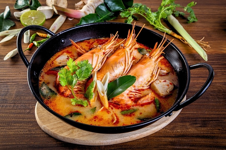 Das Besondere an dieser Suppe sind die typischen Thai-Aromen: Zitronengras, Kaffirlimettenblätter, Galgant, Fischsauce, Limettensaft und frische Chilis sorgen für ein ausgewogenes Zusammenspiel aus Säure, Schärfe und Tiefe. Ergänzt wird das Ganze mit Garnelen und meist Champignons oder Thai-Pilzen.